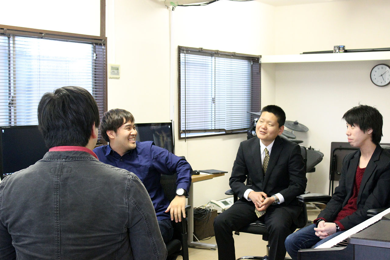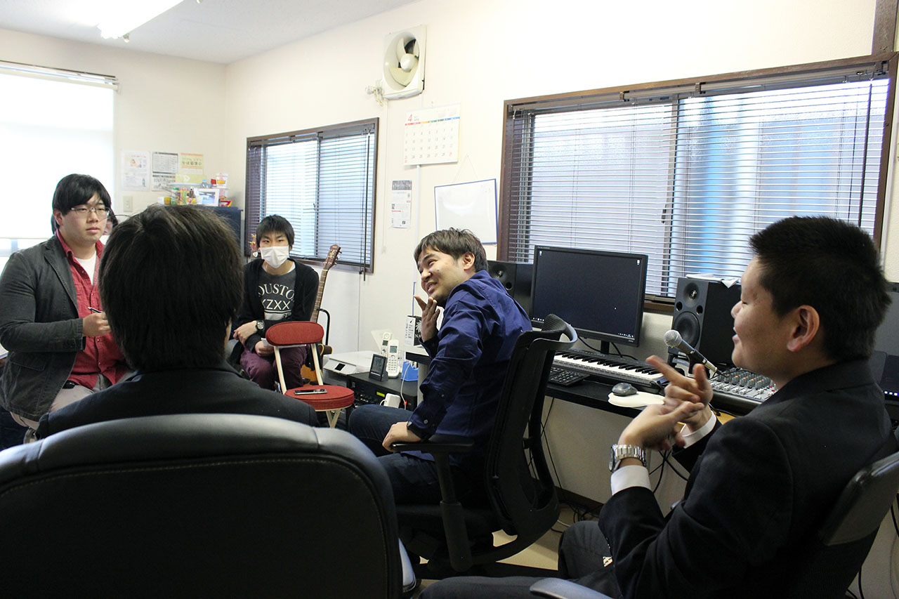 音デ2期生の佐藤郁也くん(代表)、3期生の相原恒くん、4期生の河添幸之助くんの3名が運営しているスタジオにお邪魔して、在学生が聞きたいことや知りたいことを聞いて来ました。インタビューは3時間に及びましたが、先輩達も丁寧に質問に答えてくれ、学生達に取っては楽しく充実した時間になったようです。